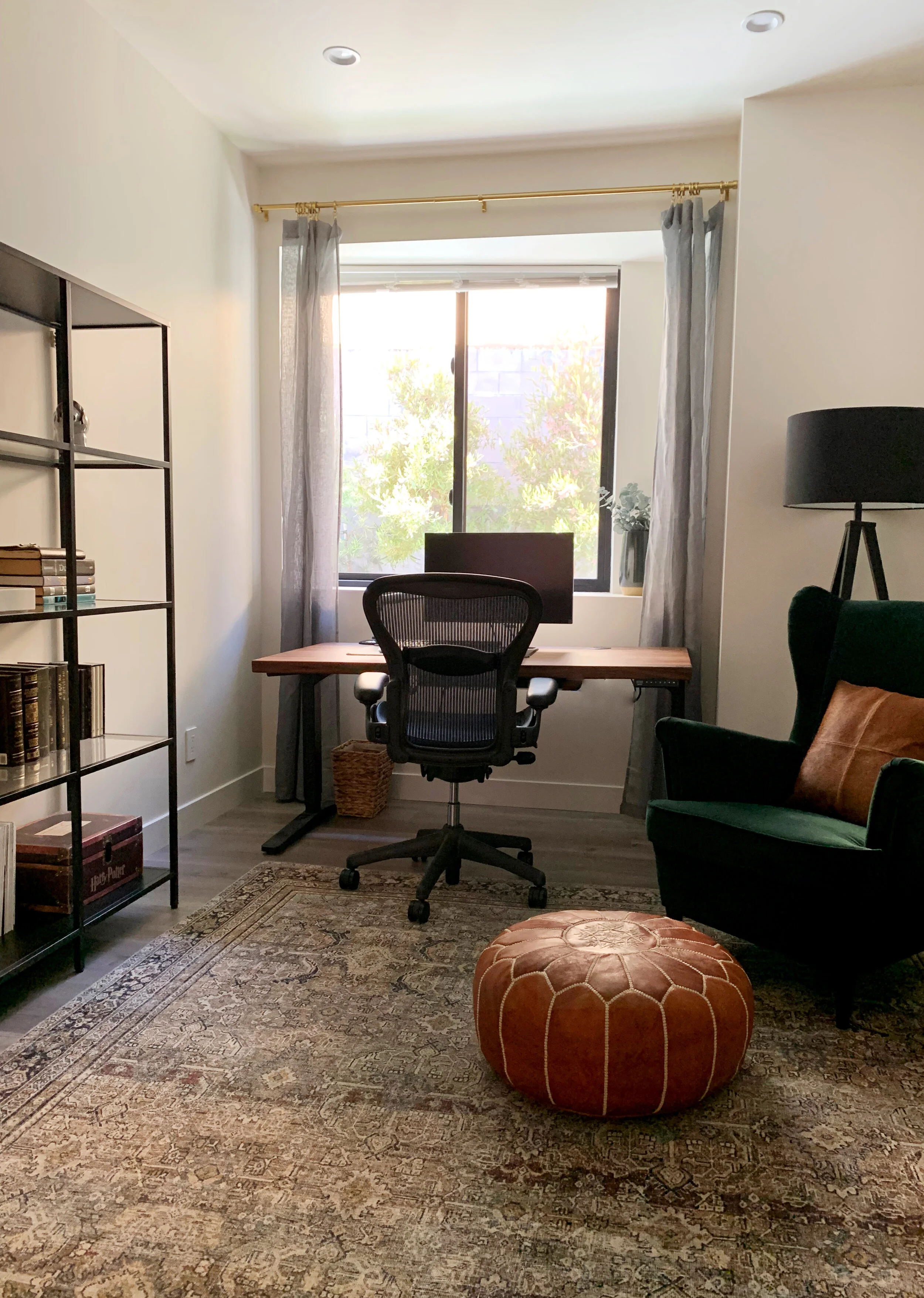 Desk for Me: After I got over the couch, I fantasized about Denis and I reading together in two comfy arm chairs. But as the pandemic dragged on, it became clear that one desk wasn’t going to cut it for us. Bringing in a desk for me meant that we only had space for one chair, and even that was crowding things a little. Since it was the last piece of furniture we were buying, I picked my desk around the style of the rest of the space (and made Denis promise that if we ever moved into a home with space for two offices, I could pick out a new desk).